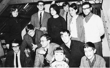 Linksboven: Marijke Stark, studente Nederlands, later getrouwd met Frans Pohlman; Henry VogeL, student economie; Janny FranckE, studente Duits?; René van Oosterwijk, student politicologie; Lies Francke (zusje van Janny); Eddo RosenthaL, student economie?.